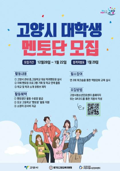 고양시 산하 고양시청소년재단(대표이사 박윤희)의 고양시청소년진로센터가 진로 고민이 있는 관내 청소년들의 멘토가 되어줄 대학생을 모집한다.