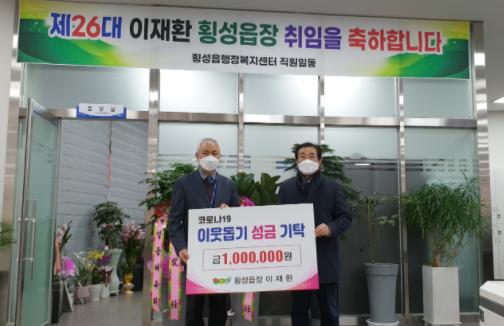 지난 1월 5일 이재환 횡성읍장은 코로나19로 힘든 시기를 보내고 있는 군민들과 어려운 이웃에 사용해 달라며 횡성군사회복지협의회에 성금 1백만원을 기탁했다.
