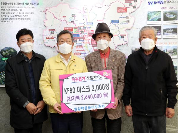 밀양백중놀이보존회는 6일 새해를 맞이하여 저소득가구에 전달해 달라며 마스크 2,000장(환가액 2,640,000원)을 밀양시에 기탁했다.
