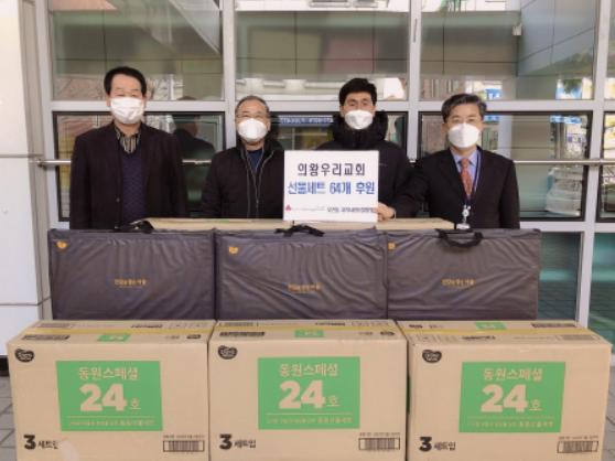 의왕시 의왕우리교회에서 코로나19로 인해 어려움을 겪고 있는 이웃에게 전달해 달라며 5일 선물세트(참치·햄) 64개를 오전동 주민센터에 전달했다.
