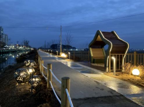 동산교부터 행복복지센터까지 대간선수로변 770m 구간에‘강곁으로 흐르는 금빛, 은하수로’라는 디자인 컨셉으로 보행테크와 농로에 볼라드등, 감성글라스조명, 물방울조명, 별자리조명, 교량조명 등 경관조명을 설치해 조도를 확보하고 야간경관을 연출했다.