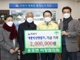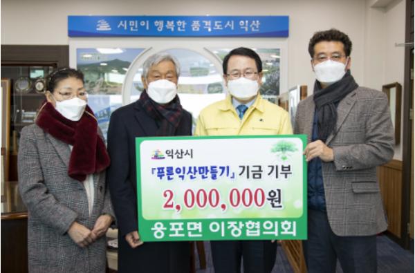 익산시 웅포면 이장협의회는 신축년 새해를 맞아 6일 익산시청을 방문해 푸른익산만들기에 써 달라며 성금 200만원을 (사)푸른익산가꾸기운동본부에 기탁했다.