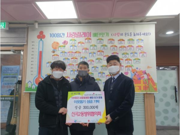 의정부시 신곡2동 방위협의회는 1월 5일 신곡2동 주민센터를 방문하여 100일간 사랑릴레이 배턴잇기 운동에 성금 30만 원을 기탁했다.