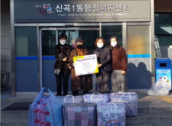 의정부시 신곡1동 새마을부녀회는 12월 30일 의정부 범시민 사랑 나눔 운동 100일간 사랑릴레이 배턴잇기에 동참하여, 지역 내 소외된 이웃들에게 전달해달라며 이불 5채를 기탁했다.