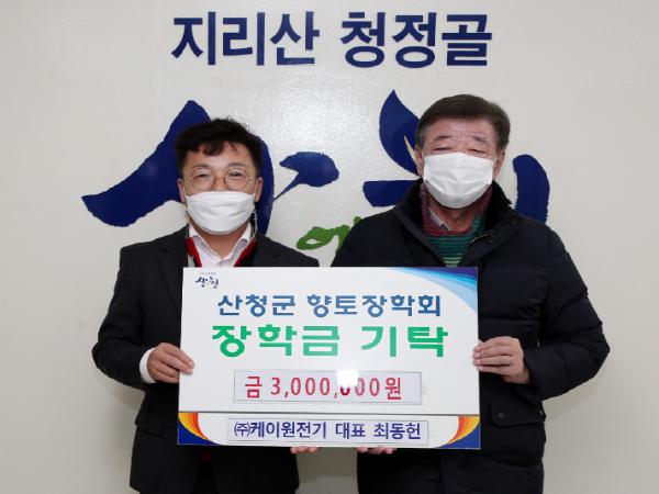 산청군은 산청지역 향토기업인 ㈜케이원전기(대표 최동헌)가 산청군향토장학회에 300만원의 장학금을 기탁했다고 6일 밝혔다.