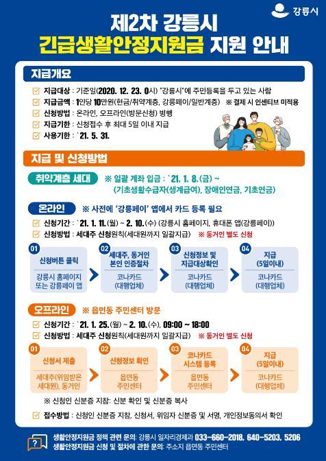 코로나19로 어려움을 겪는 시민들의 생계지원과 침체된 지역경제 활성화를 위한「강릉시 2차 긴급생활안정지원금」신청 접수가 2021년 1월 11일부터 시작된다.