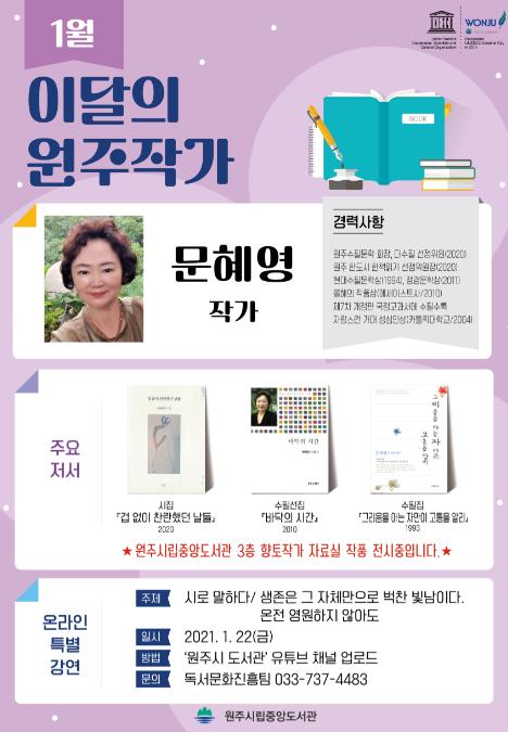 1월 중으로 ‘시로 말하다 / 생존은 그 자체만으로 벅찬 빛남이다. 온전 영원하지 않아도’라는 주제로 최근 코로나19 확산 속에 생존의 위협을 받으며 어려움을 겪는 현대인들에게 생명의 존엄성과 함께 삶의 의미와 가치를 되새길 수 있는 특별 강연을 원주시 도서관 유튜브 채널에 업로드할 예정이다.