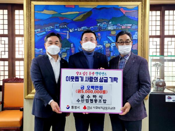 굴수하식수산업협동조합(조합장 지홍태)은 1월 5일 통영시를 방문하여 이웃사랑 성금으로 500만원을 기탁했다.