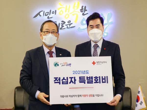 의왕시는 6일 시청 시민소통실에서 2021년 적십자 특별회비를 대한적십자사 경기도지사에 전달했다.