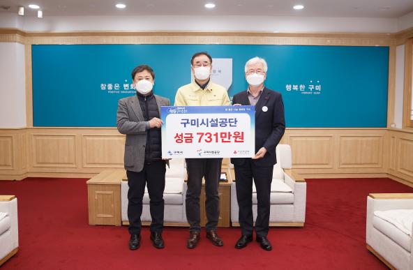 구미제일교회(담임목사 김경택)에서 성탄절 동안 성도들이 한마음 한 뜻으로 모금한 성금 1,300만원을, 구미시설공단(이사장 채동익)에서는 임직원이 모은 성금 731만원을 구미시에 기탁하였다.