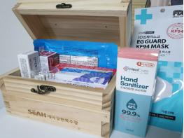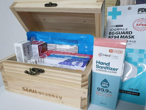 약상자는 일상생활에서 사용할 수 있는 일반약품, 파스, 밴드와 코로나19 예방을 위한 마스크, 손소독제 등으로 구성되었다.