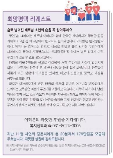 2014년 6월부터 위기가정에 대한 시민들의 관심과 지원을 확산하기 위해 마련된 ‘희망평택 리퀘스트’는 취약계층이 위기를 극복하고 새로운 희망을 얻을 수 있는 기회를 제공하는데 큰 역할을 하고 있다.