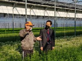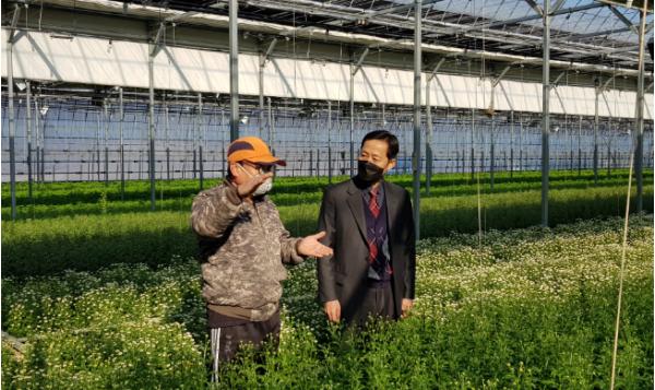 이상찬 소장은 6일 강내면 스프레이국화 재배농가 방문을 시작으로 영농현장을 점검하며, 코로나19로 어려운 농업인들을 격려했다.