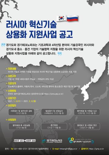 경기도가 ‘2021년 러시아 혁신기술 상용화 지원사업’에 참여할 도내 기업을 6일부터 다음달 8일까지 모집한다.
