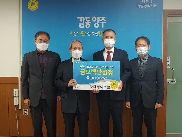 양주시희망장학재단은 6일 ㈜대성아스콘에서 신축년 새해를 맞아 새 시대를 여는 지역 인재육성을 위해 써달라며 장학기금 500만원을 기탁했다고 밝혔다.
