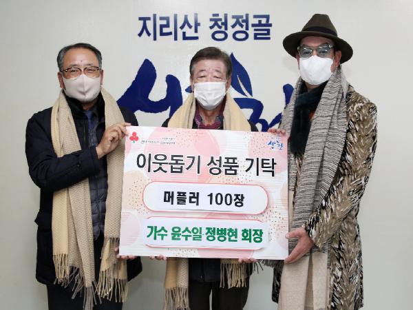 가수 윤수일과 정병현 비즈피어(주) 회장이 6일 산청군을 찾아 사랑의 머플러 100장을 기부했다.