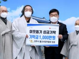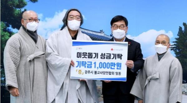 광주시 불교 사암연합회 회장 청호스님은 지난 5일 광주시청을 방문, 도움의 손길이 필요한 어려운 이웃에게 써 달라며 성금 1천만원을 기탁했다.