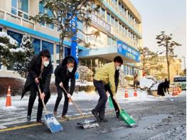 대전광역시 중구은 한파에 폭설까지 겹친 7일 오전, 중구청 직원들이 구청 앞 제설작업을 실시하며, 내 집(점포?회사) 앞 눈치우기 캠페인에 앞장서고 있다.