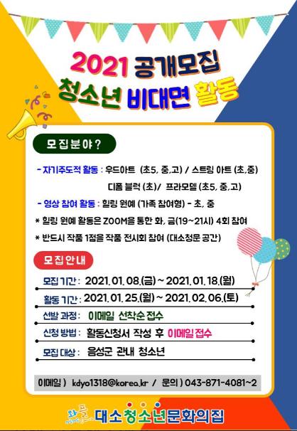 음성군 대소청소년문화의집은 청소년의 올바른 정서 함양과 건전한 문화활동 증진을 위한 ?년 비대면 청소년활동 프로그램’을 운영한다고 7일 밝혔다.