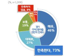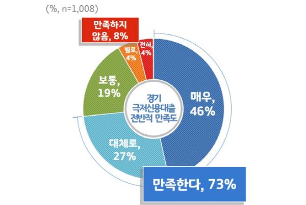 이용자 73%가 경기 극저신용대출에 대해 전반적으로 ‘만족한다(매우 만족 46%, 대체로 만족 27%)’고 답했다. ‘보통이다’는 19%, ‘만족하지 않는다’는 응답은 8%에 그쳤다.