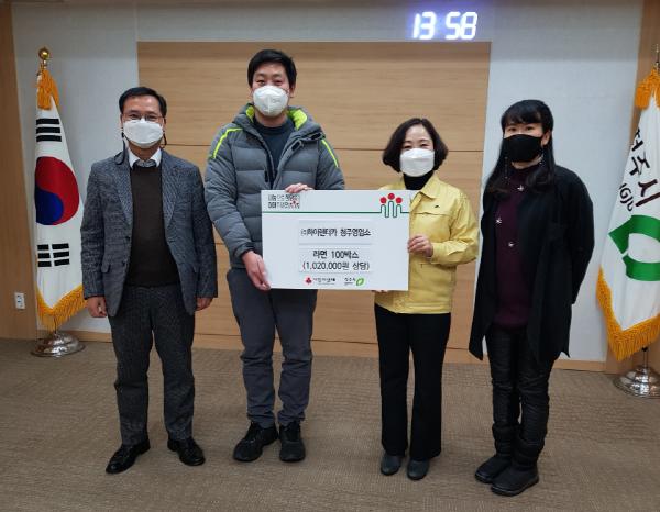 ㈜하이렌터카 청주영업소가 7일 시청 직지실에서 저소득 가정에게 지원해 달라며 100만 원 상당 라면 100박스를 청주시에 기탁했다.