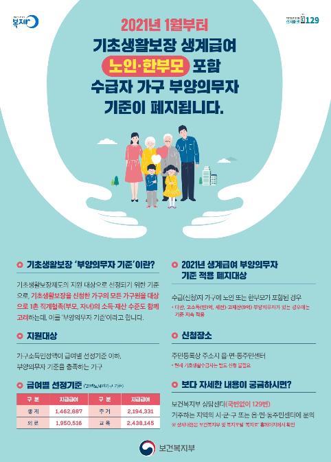 이에 따라 노인, 한부모가구가 있는 생계급여 수급자 가구는 부양의무자 기준이 폐지되며, 수급(신청)자 본인의 소득·재산기준만 충족하면 부양의무자가 있어도 생계급여 지원을 받을 수 있다.