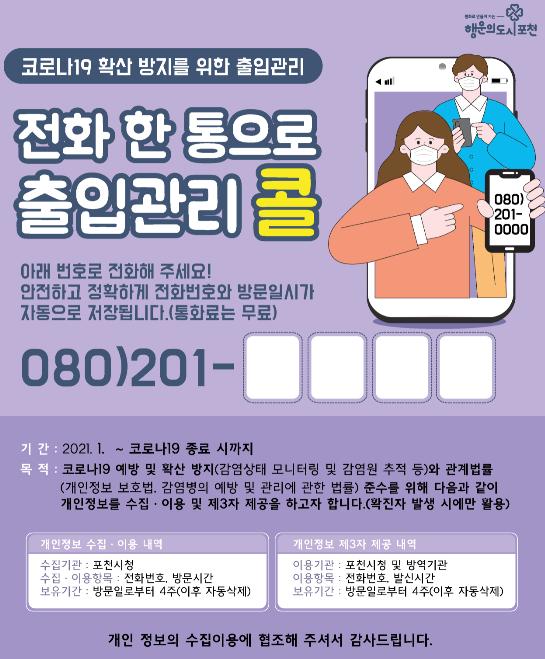 포천시가 전화 한 통으로 출입기록을 남기는 ‘080 콜 체크인 서비스’를 1월 중 도입한다.