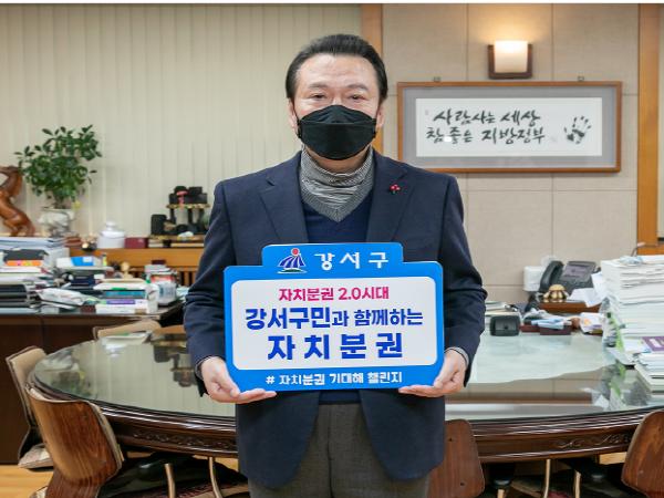 노현송 서울 강서구청장이 7일 구청장실에서 자치분권 2.0시대 『자치분권 기대해』 챌린지에 참여했다.