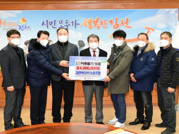 김천버스(주) 노동조합에서는 5년 전부터 운전기사들의 월급에서 3,000원씩을 모아 매년 연말연시 사랑의 성금 100만원 및 300만원 상당의 쌀, 라면, 휴지 등의 현물을 기부하였으며, 올해는 코로나19로 인하여 현물 대신 사랑의 성금으로 기부하였다.