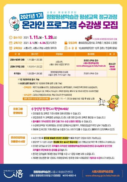 ‘시흥시여성비전센터’가 ‘정왕평생학습관’으로 명칭을 변경하고 1기 정규과정 온라인프로그램 수강생을 모집한다.