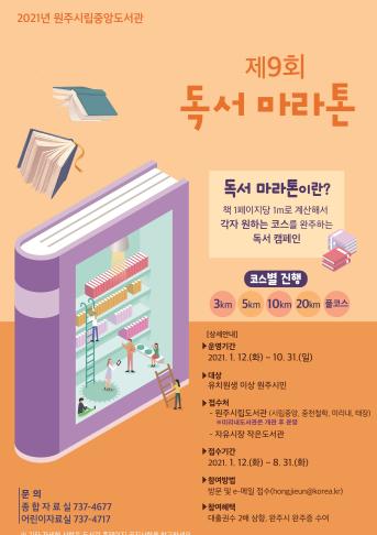 원주시립중앙도서관은 오는 12일부터 제9회 독서마라톤 대회 참가자를 모집한다.