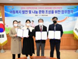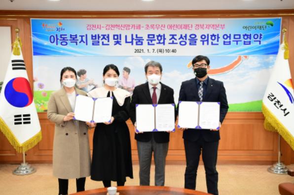 김천시는 김천혁신맘카페, 초록우산 어린이재단 경북지역본부와 지난 7일 김천시청 접견실에서 ‘김천 아동복지발전 및 나눔 문화 조성’을 위한 업무 협약을 체결했다.