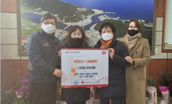 한국 여성 어업인연합회 강구수협 분회(회장 박옥수) 회원 일동이 지난 7일 강구면 행정복지센터를 방문해 불우이웃돕기 성금 100만원을 기부했다.