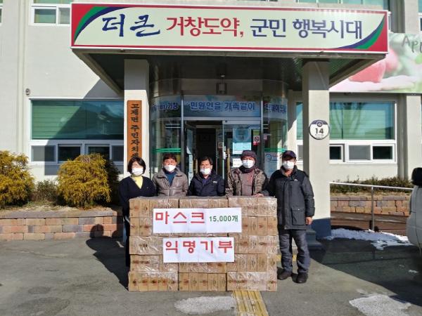 거창군 고제면은 관내에 거주하는 익명의 기부자가 면민을 위해 코로나19 예방 마스크 15,000개(450만원 상당)를 기부했다고 8일 밝혔다.