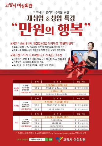 고양시 여성회관은, 코로나19 위기상황에서도 재취업과 창업을 준비하는 시민들을 응원하기 위해 모든 강좌의 수강료를 만원으로 책정한 ‘만원의 행복’특강 패키지를 이달 18일부터 29일까지 개설한다.