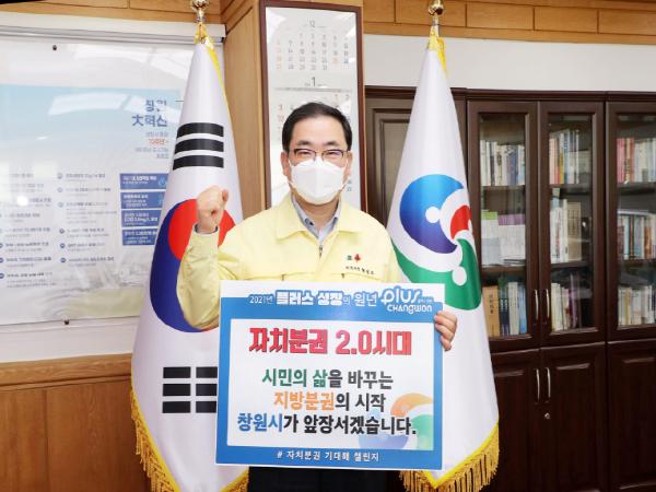 허성무 창원시장은 8일 집무실에서 ‘자치분권 기대해’메시지 챌린지에 참여해 “시민의 삶을 바꾸는 지방분권의 시작!! 창원시가 앞장서겠다”고 약속했다.