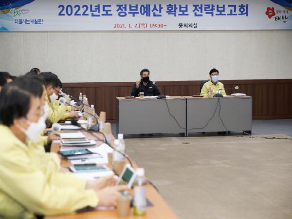 군은 지난 7일 군청 중회의실에서 가세로 태안군수, 군 관계자 등이 모인 가운데 ‘2022년 정부예산 확보 전략보고회’를 갖고 주요 전략사업 및 현안사업 추진에 따른 예산확보 방안을 논의했다.