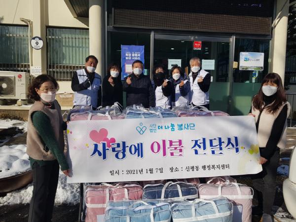 (사)더 나눔(이사장 김종걸)은 지난 7일 저소득 독거어르신들에게 전달해 달라며 평택시 신평동행정복지센터(동장 남상우)에 이불 17채를 기탁했다.