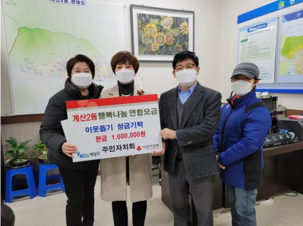 인천 계양구 계산2동 주민자치회(회장 김동규)는 지난 6일 계산2동 행정복지센터(동장 정대균)에 성금 100만 원을 기탁했다.