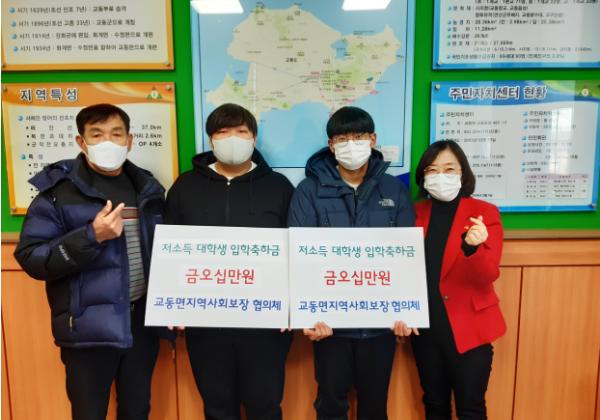 강화군 교동면지역사회보장협의체(위원장 황긍복)는 8일 신입 대학생 2명에게 입학 축하금 100만 원을 전달했다.