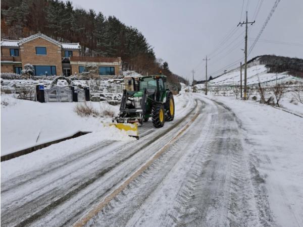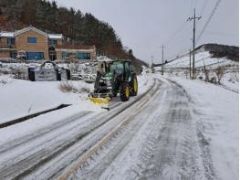 8일 면에 따르면 이호리 산수동 마을주민 최영수(57세)씨는 이른 새벽부터 본인소유의 농업용 트랙터를 이용하여 스스로 제설작업을 실시했다.