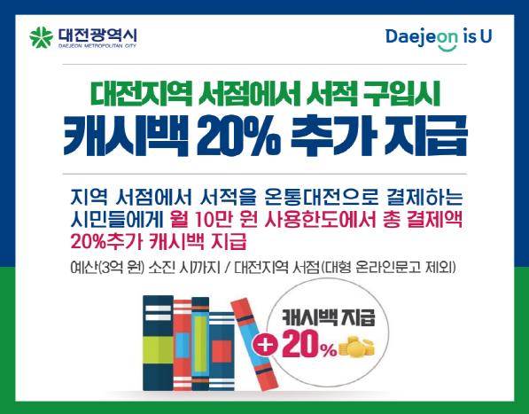 대전시민은 지역서점에서 온통대전 사용 한도 10만 원까지 지역서점에서 도서를 구입하면 20% 수준의 캐시백(월 최대 2만 원)을 추가 적립 받을 수 있다.