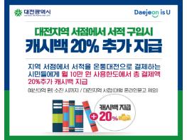 대전시 노기수 문화콘텐츠과장은 “이번 도서 캐시백 지급 사업은 최근 코로나 19로 어려움을 겪고 있는 지역 서점의 경영난 해소와 시민들의 책 읽는 문화를 정착시키기 위해 추진하는 것이며, 이외에도 독서문화강좌, 동화구연 등 지역서점에서 체험할 수 있는 견학 프로그램도 운영할 계획”이라고 말했다.