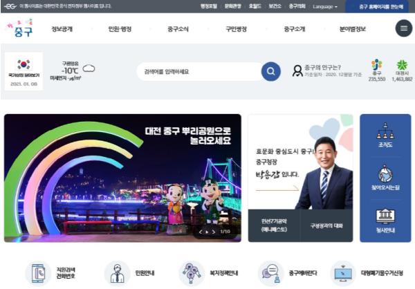 박용갑 청장은 "2021년 1월 11일부터 전면 개편된 새로운 홈페이지를 통하여 구민들이 원하는 정보를 제공할 수 있도록 관리·운영에 최선을 다하겠으며, 개편된 중구청 홈페이지에 많은 관심과 이용 부탁드린다”고 밝혔다.