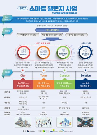 국토교통부는 시민과 기업, 지자체가 힘을 모아 기존 도시 문제를 해결하기 위한 혁신적인 서비스를 찾아내고, 만들어 나가는 2021년 스마트챌린지 사업 공모를 1월 12일부터 시작한다.