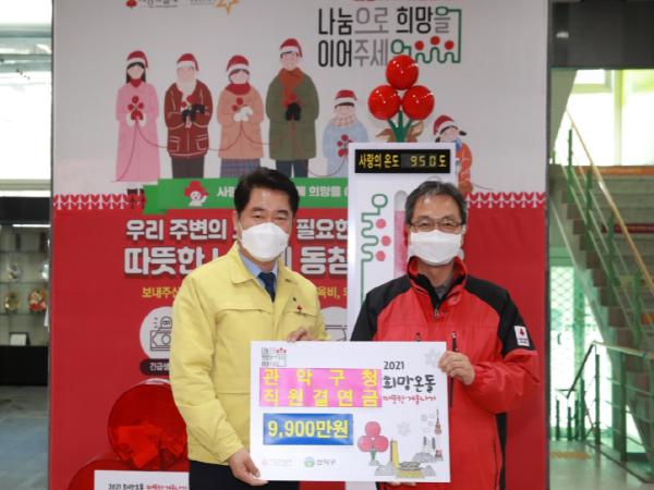관악구가 ‘2021 희망온돌 따뜻한 겨울나기’ 성금으로 직원들이 지난 1년간 모은 기부금 9천 9백만원을 서울 사회복지공동모금회에 전달했다.