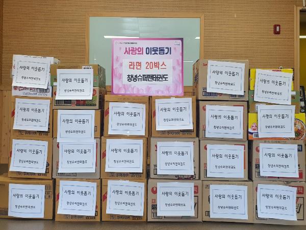 창녕군은 지난 8일 창녕슈퍼맨태권도(관장 유기훈)에서 재원중인 태권소년·소녀들이 십시일반으로 모은 라면 20박스를 창녕군드림스타트에 기탁했다고 밝혔다.
