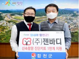 합천군 가야면 성기리 출신 정점규((주)젠바디 기술본부 CTO)대표는 지난 8일 합천군청을 방문하여 군민의 코로나19 선제적 검사에 써 달라며 신속항원 진단키트 1만개(1억원 상당)를 기탁했다.