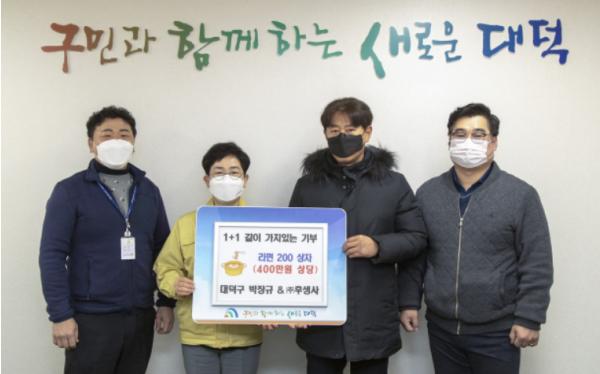대전광역시 대덕구 중리동에 위치한 후생사와 대덕구청 박장규 주무관은 11일 동절기 어려움에 처한 주민에게 전달해 달라며 라면 200상자(400만원 상당)를 기탁했다.