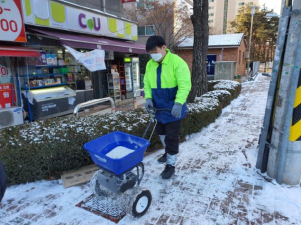 의정부시 가능동주민센터는 1월 6일 폭설로 인한 빙판길 안전사고 예방을 위하여 밤새 제설제를 살포하고 1월 7일 새벽부터 신속한 제설작업을 실시했다.